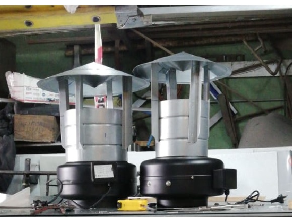 plástico ABS y eje montado sobre rodamientos de bola para 10.000 horas de trabajo. El equipo está provisto de una base para montaje en techo o pared, apto para trasegar humo de parrillas y quinchos de casa, con mas de 4 metros de ductos desde la fuente de calor y con campana provista de filtros metálicos.
